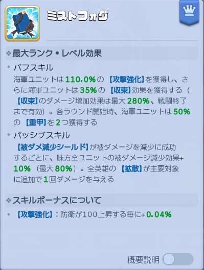海軍ユニットに対する【攻撃強化】効果、被ダメージ減少シールドの種類数に応じてダメージ増加バフを得る【収束】効果、スキルダメージを減らす【重甲】効果、【被ダメージ減少シールド】発動ごとにダメージ減少バフが入る効果、【拡散】ダメージを追加で+1回する効果の5つの効果を持つ。