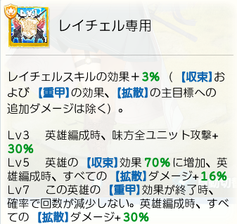 マリナは専用なしで1枚、専用スキル5で2枚に増える形だったが、レイチェルは専用なしの段階で2枚獲得することができる。
